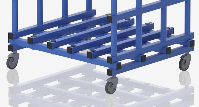 Le chariot Aquafitmat est équipé des 4 roulettes de déplacement. À vide ou chargé de 5 tapis Aquafitmat, il se dépace en toute facilité au bord du bassin et dans son espace de rangement.